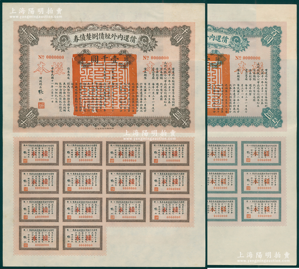 民国十一年(1922年)偿还内外短债捌厘债券(史称“九六公债”)壹百圆、壹仟圆样本共2种不同,由财政总长张弧签署,附带完整息票,罕见,九成新
