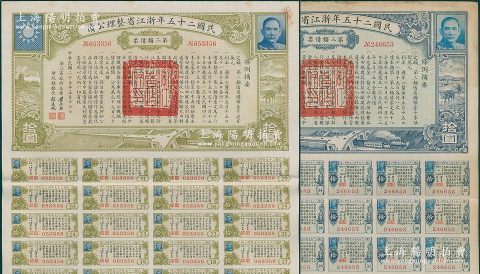 民国二十五年浙江省整理公债·第二类债票拾圆、第三类债票拾圆共2枚不同,由浙江省政府主席黄绍竑(国民党要员、新桂系创始人)签署,附带有息票,八至八五成新