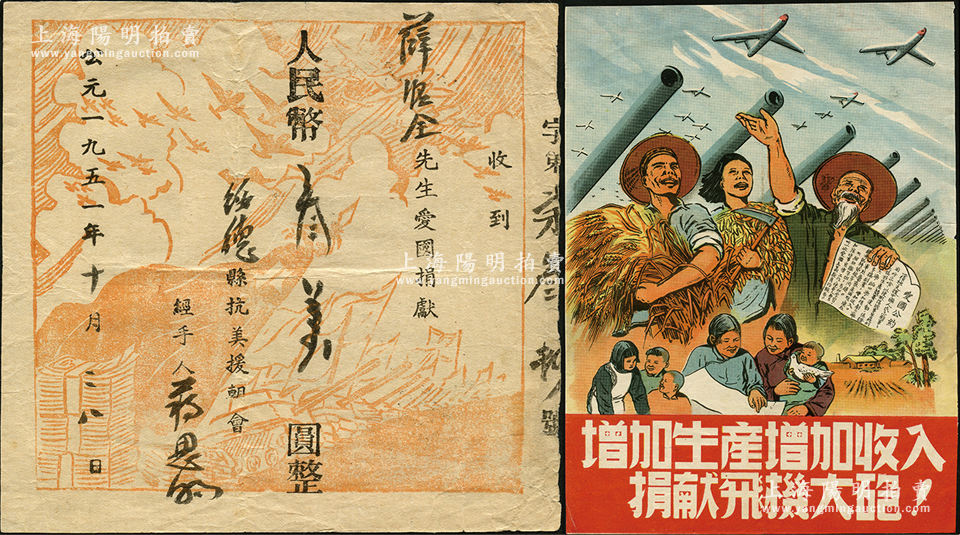 1951年(陕西)绥德县抗美援朝会之“爱国捐款”1张,面额人民币叁万圆,另附“增加生产、增加收入、捐献飞机大炮”16开大小之彩色传单1张,其上图案均极富时代之气息,可适用于展览和典藏;资深藏家出品,少见,八成新