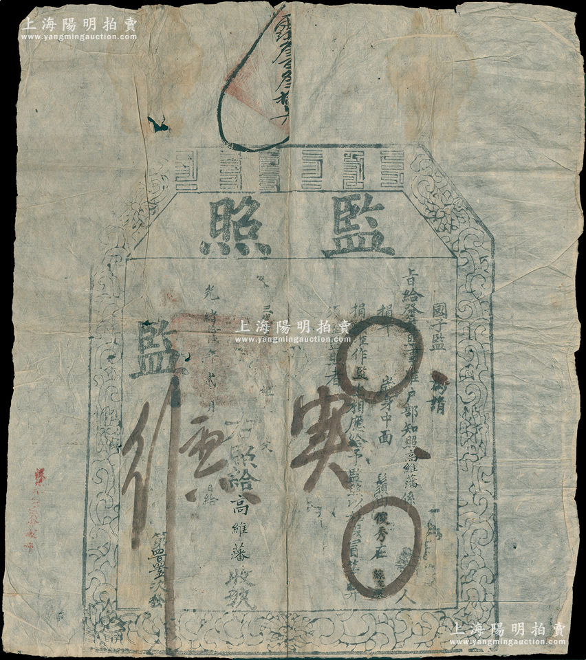 光绪拾陆年(1890年)“监照”1张,由国子监发给俊秀高维藩氏,准其遵例在苏皖赈捐中捐输监生衔;监照,即属购买文凭(科举资格),属清代买官制度之历史实证;保存尚佳,敬请预览