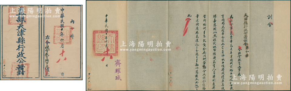 民国十年(1921年)直隶“天津县行政公署致社会教育办事处”训令1则,事为“查津邑去年旱蝗成灾,物力艰难,地方教育颇形危险,幸各办学员绅协力维持,成绩卓著,现拟照被灾地方维持教育人员特别褒奖暂行条例,呈传从优给奖以酬劳”等情,由县长齐耀珹(北洋农商总长齐耀珊之弟)签发,且附带官封1个;保存甚佳,敬请预览
