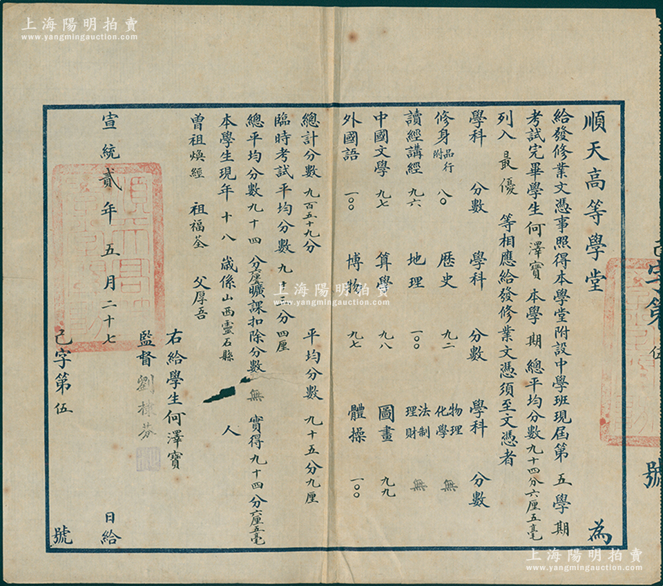 宣统贰年(1910年)“顺天高等学堂”修业文凭1张,其发行号码仅为“己字第伍号”,发给山西灵石县学生何泽宝氏,由监察刘棣芬签发;该学堂创建于1902年,于1907年更名为顺天高等学堂,新中国成立后改为河北省立北京高级中学;保存尚佳,敬请预览