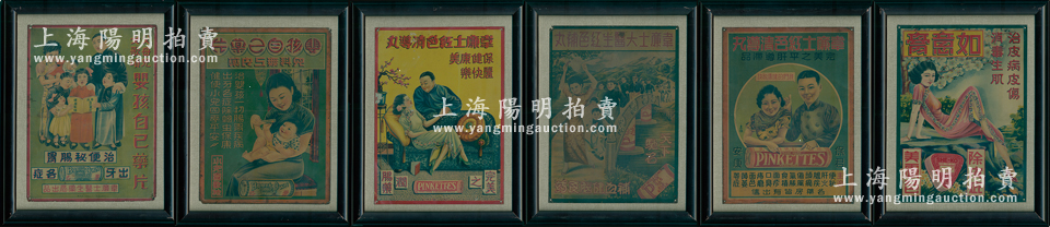 民国时期药品广告共6种,尺寸均约335×435mm,详分:威廉士红色清导丸2种、威廉士大医生红色补丸、婴孩自已药片2种、如意膏,保存较佳,均已镜框装帧,敬请预览