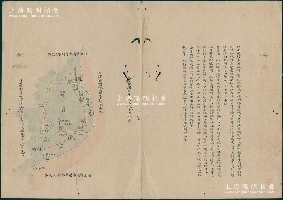 清代上海“江南水师营驻扎黄浦江、吴淞口、虹口等处”手绘地图1张,尺寸415×295mm,其上附有墨字说明;少见,保存尚佳,敬请预览