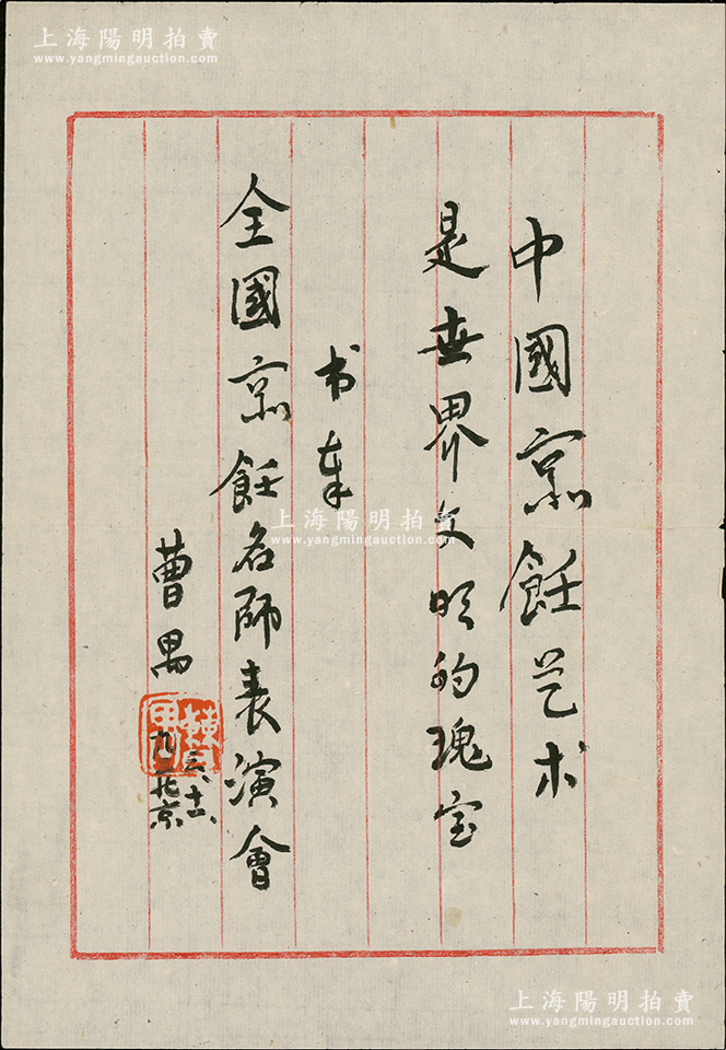 1992年现代话剧剧作家曹禺题字一页,提给全国京饪名师表演会,上书“中国京饪艺术是世界文明的瑰宝”,保存甚佳,敬请预览