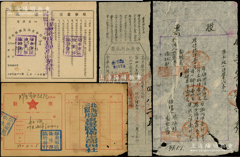 解放区老股票等共4种,详分:①1947年高平·公益成股票,内中记录8名股东之股款共10000元;②1944年高平县贷款委员会“贷款红契收据”,以土地5亩4分担保作为贷款;③1945年荣成县俚岛油业合作社股票;④1946年胶东军区卫生院合作社股票伍仟元,背印发行说明;资深藏家出品,七至八成新