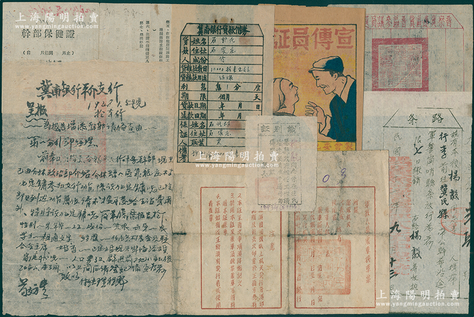 解放区证书等共8件,详分:1942年晋冀鲁豫边区太行中学校“路条”;1943年元氏县“识别证”;1948年冀南银行平介支行呈报、冀南银行贷款借券;晋察冀边区冀晋区参议员选举票、中共临汾地委“宣传员证”、晋南“干部保健证”;1948年东北人民解放军第四纵队“军政人员乘车换车票”证;资深藏家出品,保存尚佳,敬请预览
