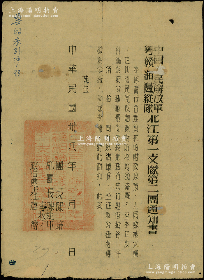 民国卅八年(1949年)“中国人民解放军粤赣湘边纵队北江第一支队第二团通知书”1份,事为“实行合理负担的财政政策,人民缴纳公粮;查本年度应缴公粮数量尚未核定,务希先行惠借稻谷,以济军食”等情,由团长陈培等署名,可与下件拍品相呼应;罕见,七成新