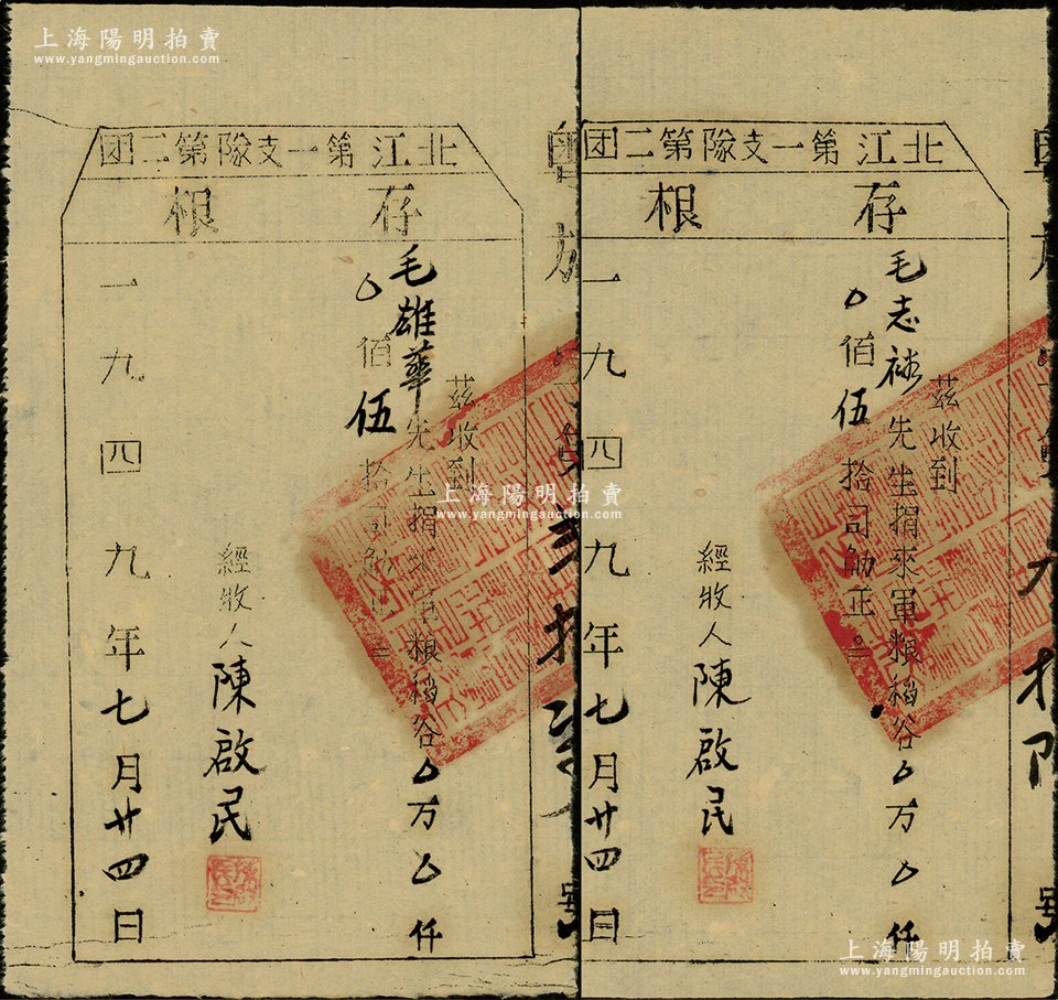 1949年(广东解放区)北江第一支队第二团“捐军粮”存根共2张不同,分由毛雄华、毛志裕捐来军粮稻谷伍拾司觔,且骑缝处均钤有“中国人民解放军粤赣湘边纵队北江第一支店第二团关防”大官印;罕见,八五成新