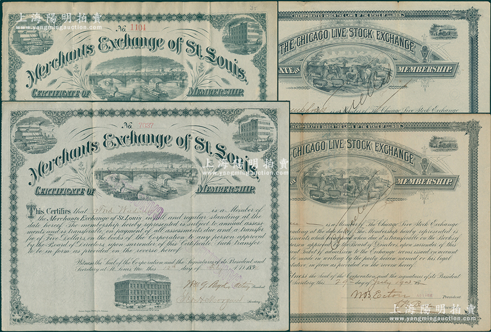 清代美国交易所席位证书共4种,详分:芝加哥证券交易所席位证书1893年第一版和1903年共2种,圣路易斯商品交易所席位证书1882年第一版和1894年共2种不同版式,内有水印;此种交易所席位证书存世极为罕见,一张证书只能代表一个交易商席位,其意义比股票更胜一筹;资深藏家出品,七五至八成新