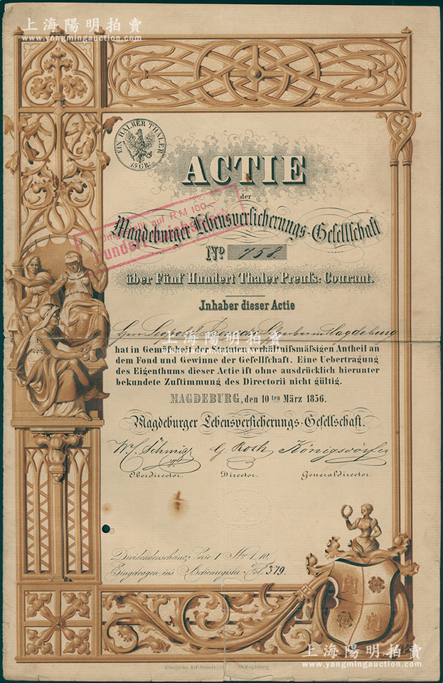 清代1856年(即咸丰六年,德商)马格德堡人寿保险公司股票,1股计500泰勒,属德国普鲁士王国之早期古典式老股票,泰勒是马克之前的货币;该公司自民国进入上海,在《上海金融志》中有记载;罕见,七成新