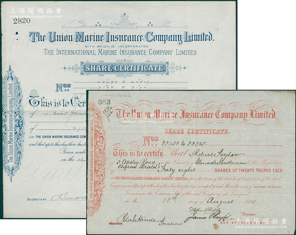 清代著名(英商)尤宁保险公司股票共2种不同,详分:1881年红色版48股、1901年蓝色版50股(每股20英镑);此乃在华著名之外商保险公司,自清末即已进入中国,至1915年在上海设立分公司;罕见,八成新