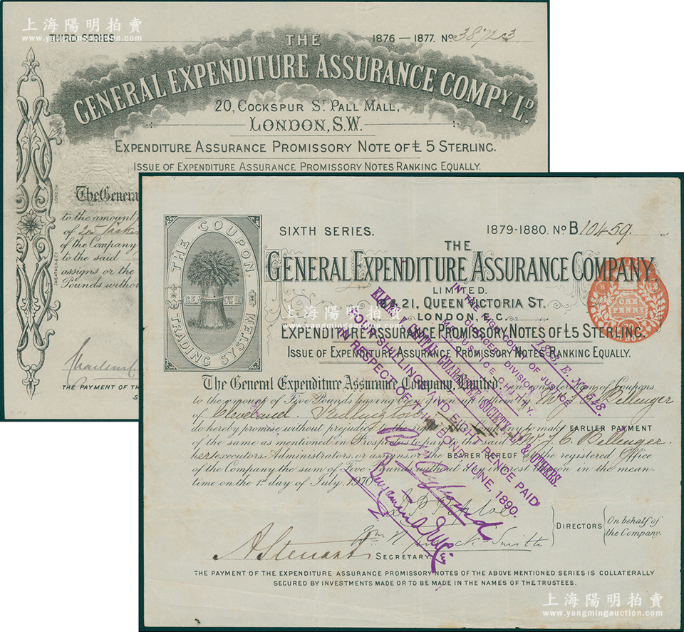 清代1876至1879年英商保众保险公司股票共2种不同,详分:第三版股票1股计5镑、第六版股票1股计5镑,均盖有皇家税章;此为英国早期著名之保险公司,至1909年在上海设立远东总公司,在华称“保众保险”;海外藏家出品,少见,八成新