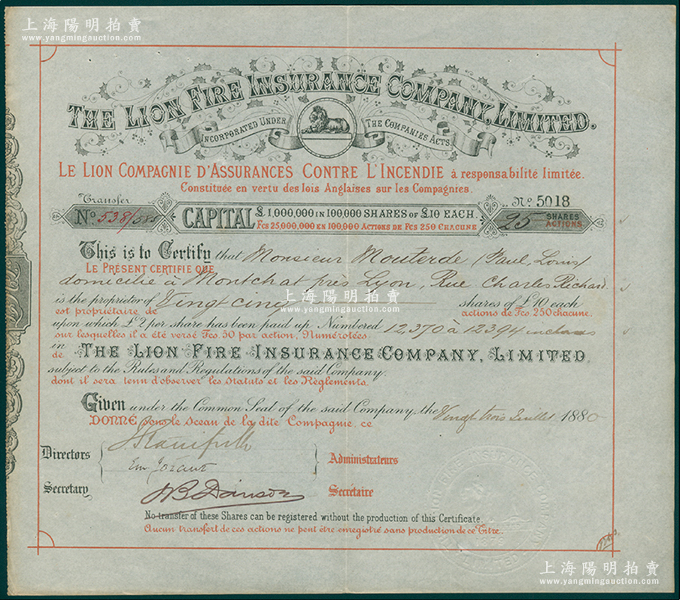 清代1880年英商延丰益寿保险公司股票,面额25股(每股10镑),该公司又称狮子火灾保险,自1915年进入上海,在华称“延丰益寿保险”;海外藏家出品,少见,八五成新