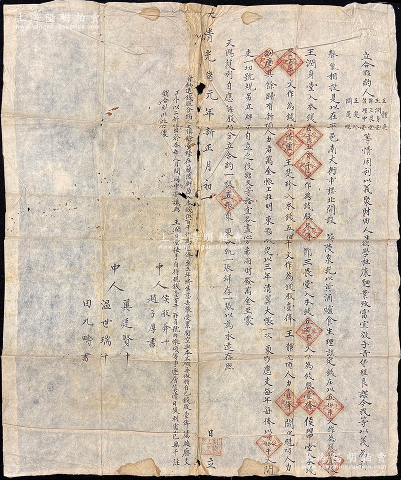 大清光绪元年(1875年)平遥“兰陵泉记”黄酒庄传统“合夥约”1份,事为“王润生堂、邓三畏堂等6人欲学杜康致富,在平遥南大街市楼北开设兰陵泉记,以黄酒炉食生理,议定500千文作为钱股壹俸,内有王润生堂入钱股叁俸、邓三畏堂和王楚珍各入钱股壹俸、侯理中堂入钱股陆厘、王体亮顶人力壹俸、阎运魁顶人力捌厘,并约定公议条款”等情;人力股,乃传统商业之激励制度,当商号获利后,财东按钱股分红,店夥按人力分红,且不承担亏损责任,正因如此,故商号从经理到夥计“莫不殚心竭力,视营业盛衰为切己之利害”,这也正是传统晋商之成功秘诀之一;此“黄酒”题材合同存世稀见,保存尚佳,敬请预览