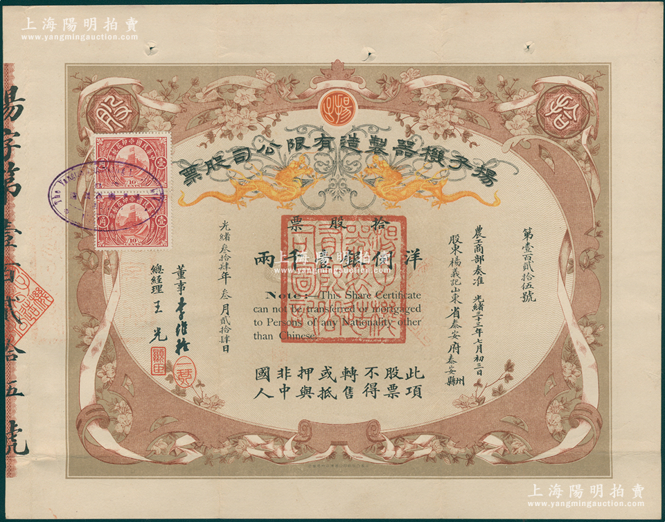 光绪叁拾肆年(1908年)扬子机器制造有限公司股票,拾股计洋例银壹千两,由董事李维格(即汉阳铁厂总办)、总经理王光签名,附带原息摺1册;该公司属清末著名民族工业,1907年由宋炜臣(燮昌火柴厂和汉口既济水电公司创办人)、顾润章等人在汉口谌家矶创办,为湖北首家大型机械厂,曾参与抗战时期重庆高炉建设;珍罕品且属首度公诸于阳明,八成新