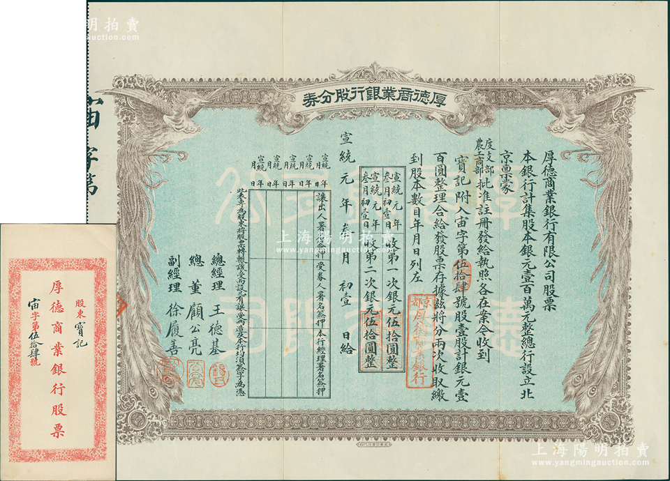 宣统元年(1909年)京都·厚德商业银行股分券,壹股计银元壹百圆,上印双凤图,附带原封套,诚属清代银行业老股票之罕见品;八五成新