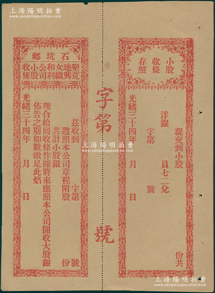 光绪三十四年(1908年)石坑乡垦荒地与女织和利公司小股收条,未填用带存根,属清代广东汕头地区老股票,少见,九成新