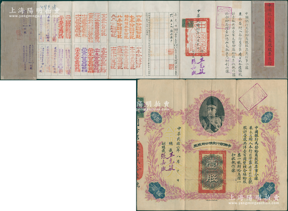 民国六年(1917年)中国银行有限公司股票(商股)壹股,上印袁世凯戎装像,由总裁王克敏、副总裁张嘉璈签名;中国老股票之名誉珍品,八成新,值得珍视和推重