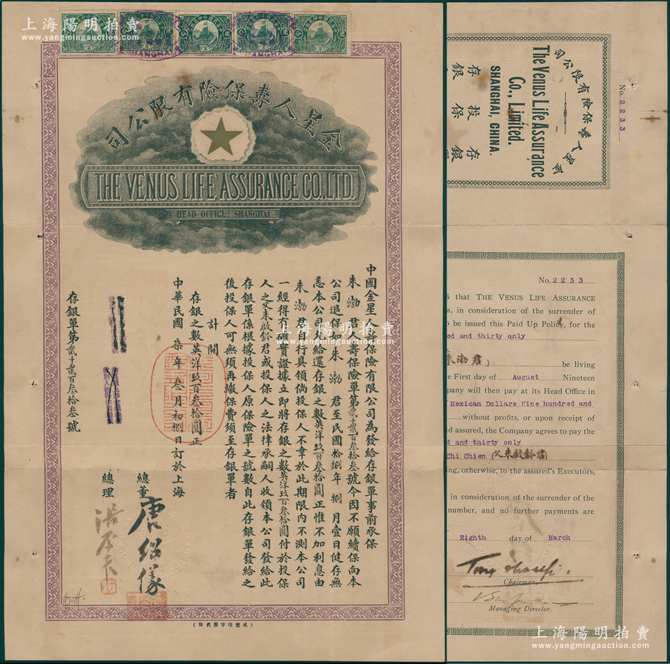 民国柒年(1918年)金星人寿保险有限公司存银单(即保单)1份,事为“前投保人朱渤(即朱启钤之子)君今不愿续保,向本公司退保,如朱渤君至1929年8月1日健存无恙,本公司允给还存银之数英洋930元(不加利息),倘投保人期间不测,则存银之数付给投保人之父朱启钤(北洋交通总长)君”等情,由总董唐绍仪(民国首任内阁总理)等署名签发;此种名人保单存世罕见,八成新,敬请预览和珍视