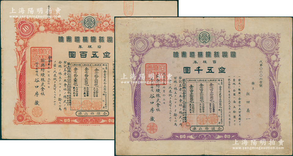 1920至1928年(上海)同兴纺织株式会社股票2种,详分:1920年百株券金五千圆、1928年拾株券金五百圆;该工厂设于上海杨树浦路2086号,在青岛开有分厂,抗战胜利后由国民政府接收,改为军政部上海被服总厂第二分厂,1958年改称上海服装厂;资深藏家出品,七五至八成新