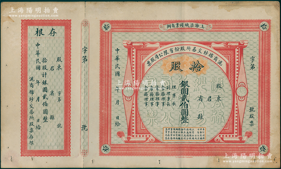 民国十年(1921年)沪商棉纱交易所股份有限公司股票,拾股计银圆贰伯圆,附带有存根;源于旧时名流遗存,珍罕,八成新,敬请预览和珍视