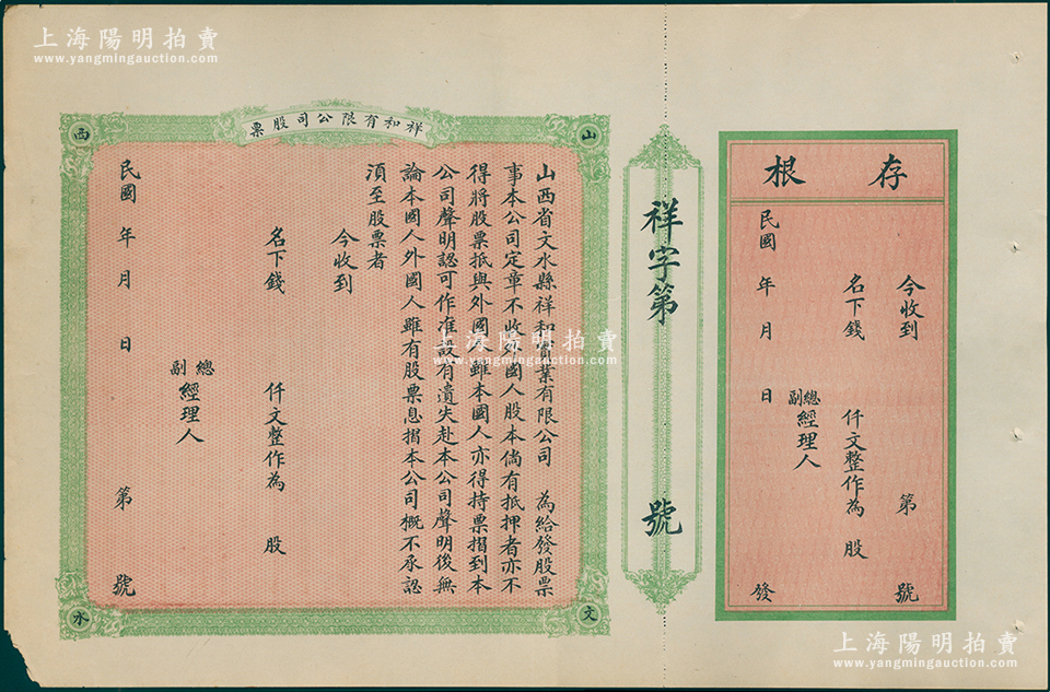 民国年山西省文水县祥和实业有限公司股票,特大型未填用附存根,背印公司简章,言明以“放贷款为职业”;少见且属首度公诸于阳明,八五成新