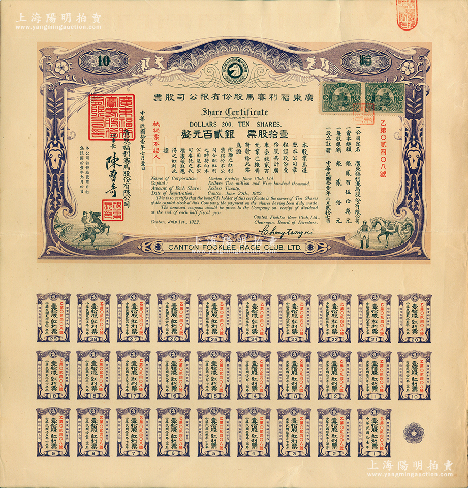 民国拾壹年(1922年)广东福利赛马股份有限公司股票,壹拾股计银贰百元,有水印,大型且附带完整息票;少见,八五成新