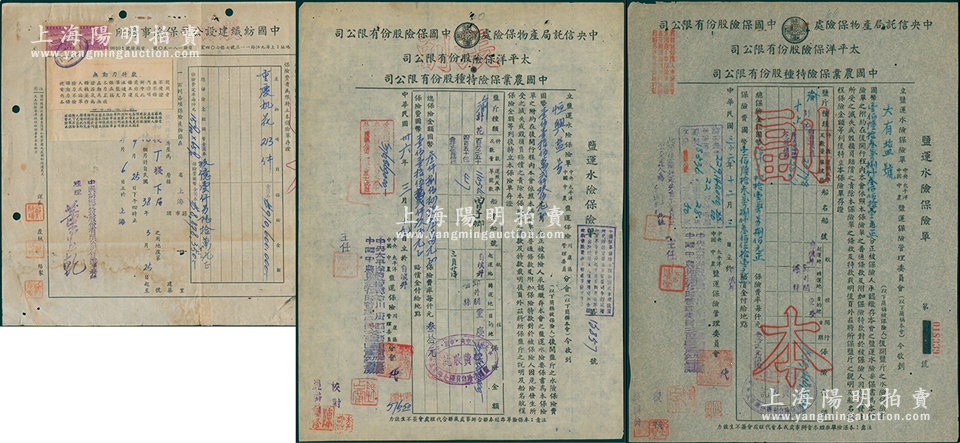民国保险单共3张,详分:①1947年“盐运水险保险单”2张不同,由“中央信托局产物保险处·中国保险股份有限公司·太平洋保险股份有限公司·中国农业保险特种兵股份有限公司联合管理处”四家联合发行,从自流井运盐至重庆;②1949年中国纺织建设公司保险事务所“火险保险单”1张,投保重庆机花213件;七至八成新