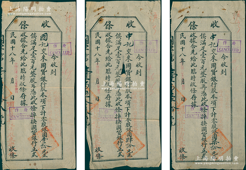 民国十八年(1929年)国货银行江西股东联合会“收条”(即股款收据)共3枚不同,面额分别为零股银圆壹拾元、肆拾元和柒拾元,且言明“此零股如凑足百元,可向裕民银行掉换百元整股收据”,少见且属首度公诸于阳明,七至八成新