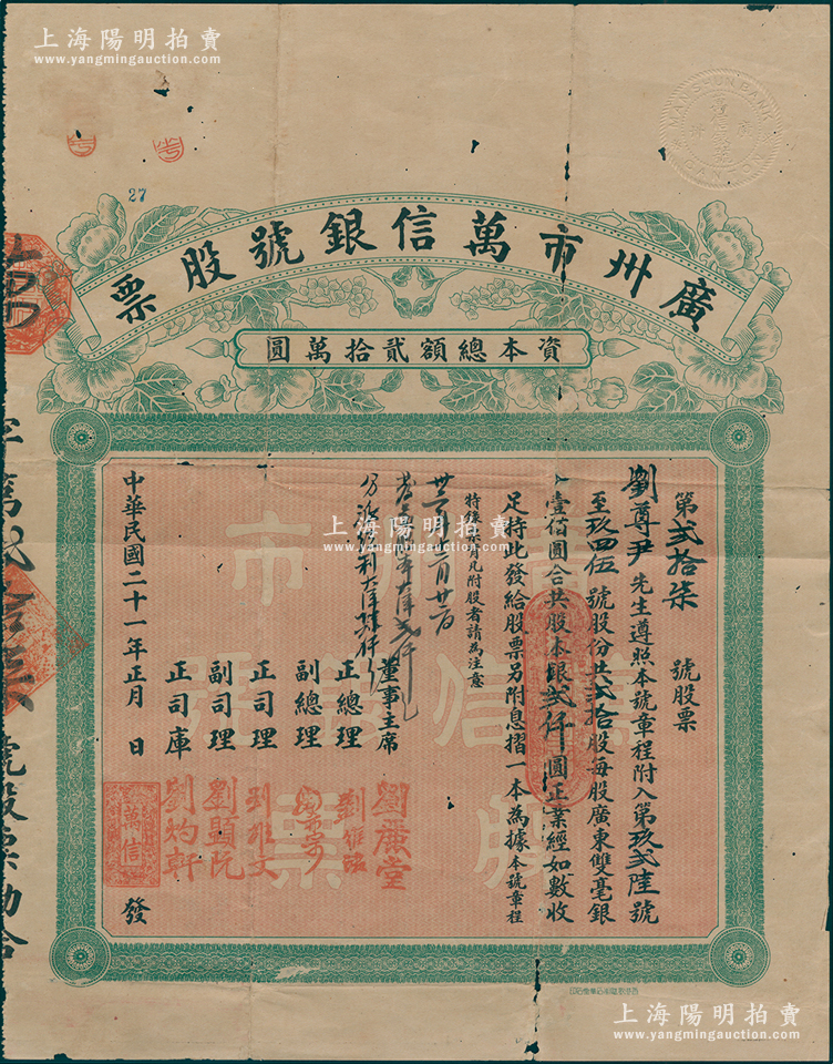 民国二十一年(1932年)广州市万信银号股票,贰拾股共股本银贰仟圆,背印章程文字,罕见,近八成新