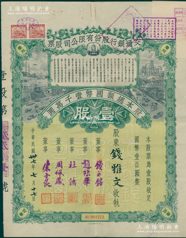 民国卅七年(1948年)交通银行股份有限公司股票,壹股计国币壹百圆,票上由董事钱永铭、赵棣华、杜镛(即上海滩大亨杜月笙)、周佩箴、宋子良签名,背面付息状况至1965年;罕见且富历史意义,八成新