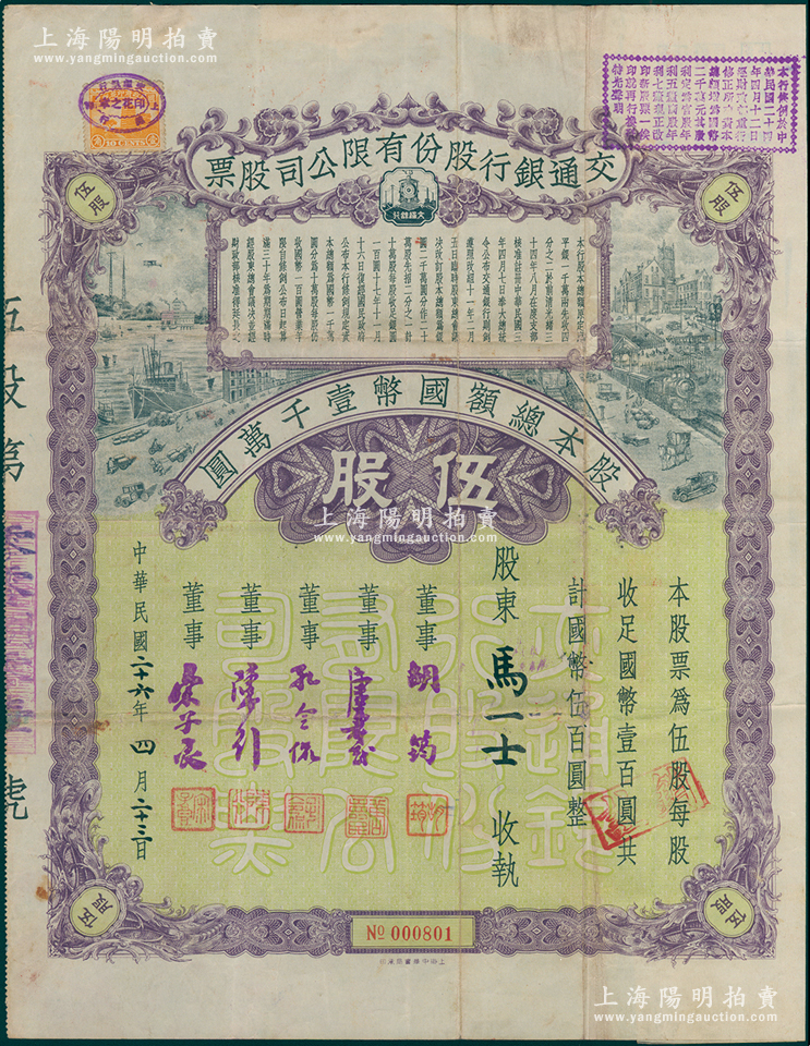 民国二十六年(1937年)交通银行股份有限公司股票,伍股计国币伍百圆,票上由董事胡筠、唐寿民、孔令侃(孔祥熙长子)、陈行、宋子良签名,背面付息状况至1965年;此种签名版存世稀见,七五成新
