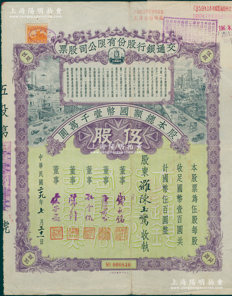民国二十九年(1940年)交通银行股份有限公司股票,伍股计国币伍百圆,票上由董事钱永铭、唐寿民、孔令侃(孔祥熙长子)、陈行、宋子良签名,背面付息状况至1965年;此种签名版存世稀见,八成新