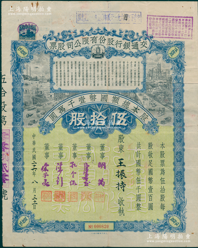 民国二十六年(1937年)交通银行股份有限公司股票,伍拾股计国币伍千圆,票上由董事胡筠、唐寿民、孔令侃(孔祥熙长子)、陈行、宋子良签名,背面付息状况至1962年;此种签名版存世稀见,七五成新
