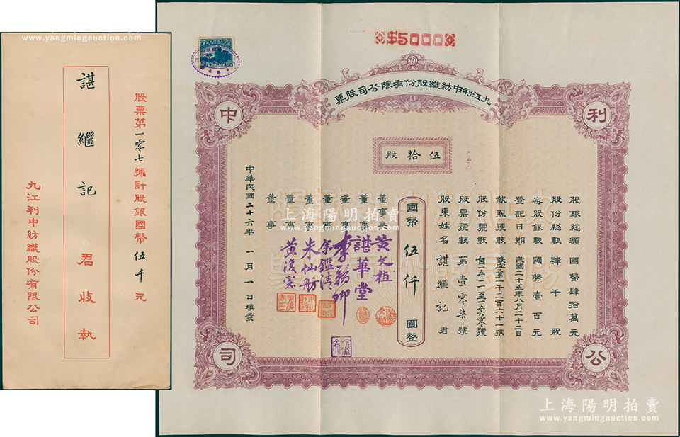民国二十六年(1937年)九江利中纺织股份有限公司股票,伍拾股计国币伍仟圆,附带原封套;该公司原为久兴纱厂,至1934年被美商吞并,1935年朱仙舫等人租办并改名利中纱厂,1945年朱仙舫等人集资向美商买回工厂,改名兴中纱厂;少见且属首度公诸于阳明,九成新