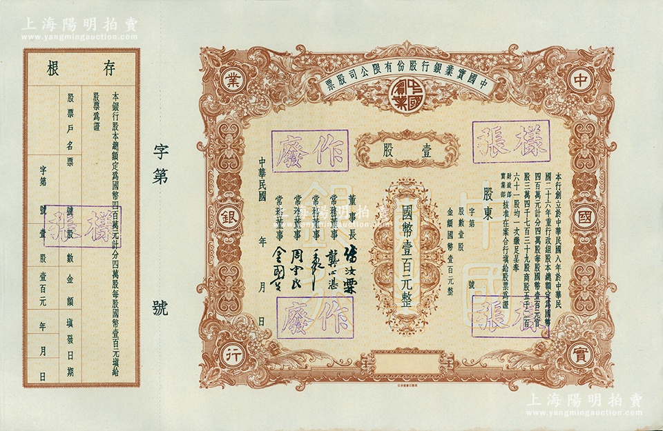 民国年(1937-)中国实业银行股份有限公司股票样张,壹股计国币壹百元;该行为民国八大商业银行之一,历史意义厚重,而是项股票印制于法币改革后国民政府加入该行官股之时,罕见,九五成新