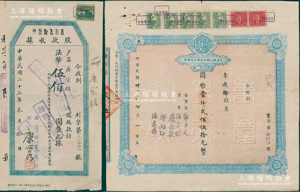 银行老股票2种,详分:①1936年四川美丰银行股款收据,伍股计法币伍佰圆,其发行号码仅为“利字第6号”,且有总经理康心如(四川金融业巨子)亲笔签名;②1942年重庆银行股份有限公司股票国币壹仟贰佰伍拾元(每股伍拾元),附带有1956年股东身份证明书及股权登记表各1张;七至八成新
