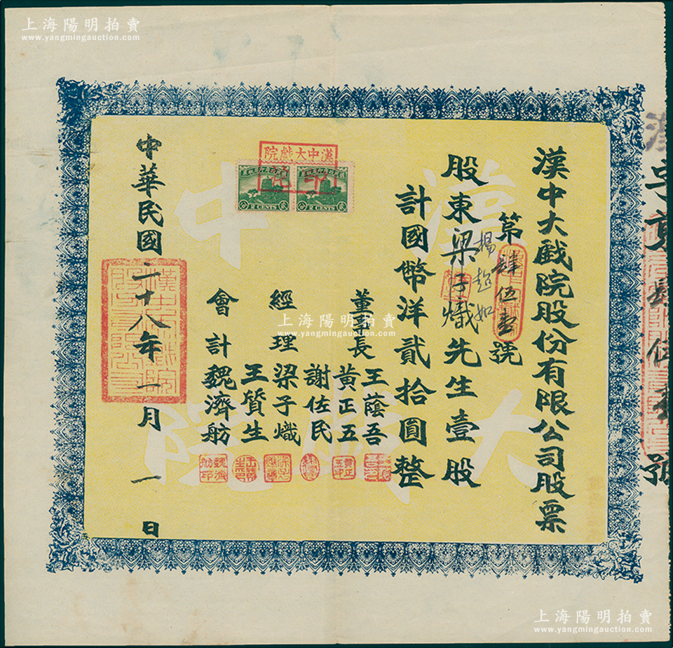 民国二十八年(1939年)汉中大戏院股份有限公司股票,壹股计国币洋贰拾圆,票上董事多为中共地下党员和进步人士,其中董事长王荫吾乃汉中商会会长,经理谢佐民(陕西汉中人)曾任南郑市人民政府副市长;八五成新