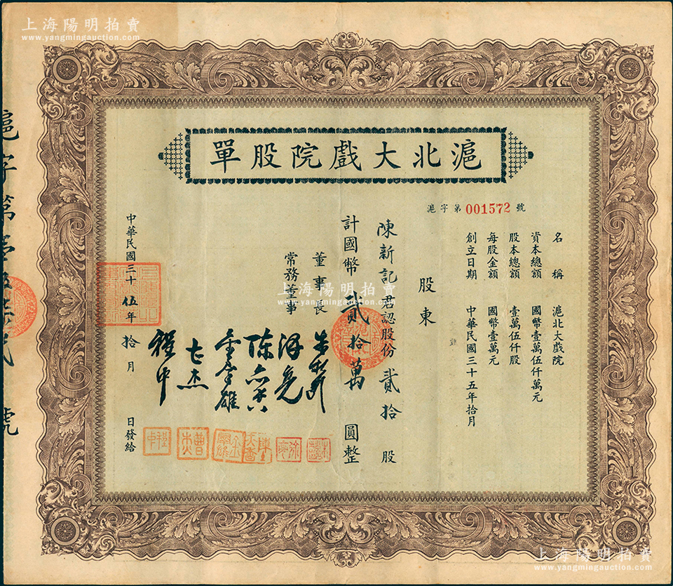 民国三十伍年(1946年)沪北大戏院股单,贰拾股计国币贰拾万圆,属第一版创立股票,票上由6人黑色签名,少见,八五成新