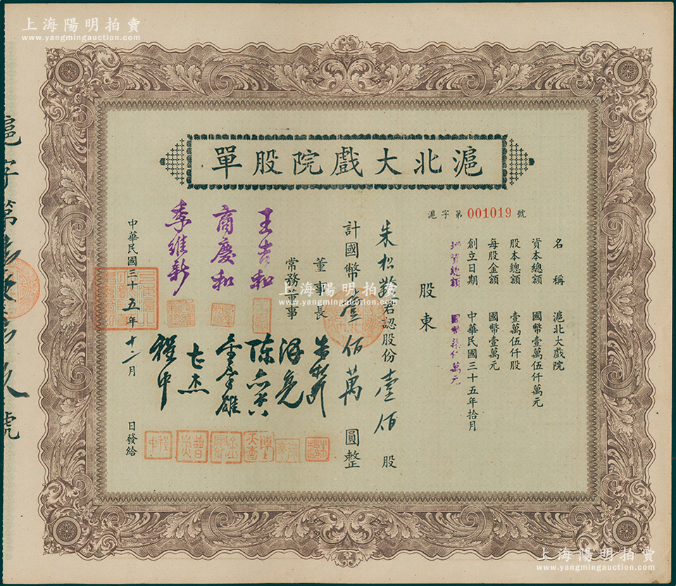 民国三十五年(1946年)沪北大戏院股单,壹佰股计国币壹佰万圆,票上股东即为该公司董事长朱松龄氏;此股票属第二版增资股,票上常务董事人数比一般所见者增加3位;少见,九成新