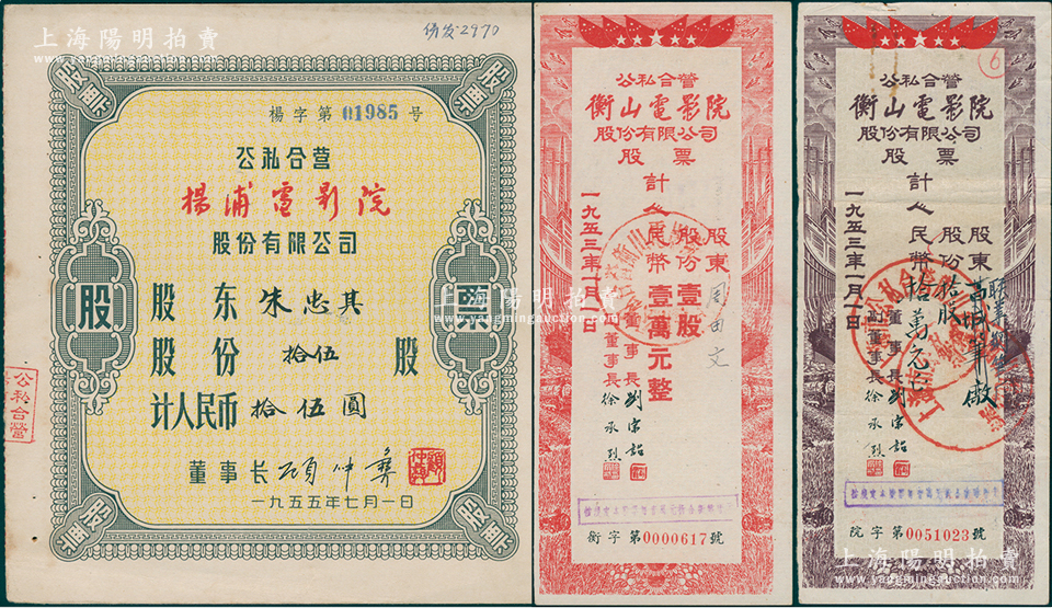 老上海公私合营电影院股票3种,详分:1953年衡山电影院股票,壹股计人民币壹万元、拾股计人民币拾万元;1955年杨浦电影院股票,拾伍股计人民币拾伍圆;八至九成新