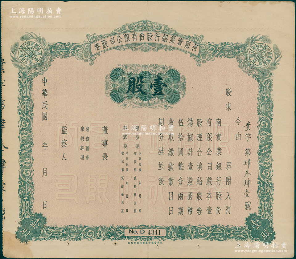 民国年(1940-)河南实业银行股份有限公司股券,壹股计国币伍拾圆,未填用发行,背印股东应守手续文字;资深藏家出品,八成新