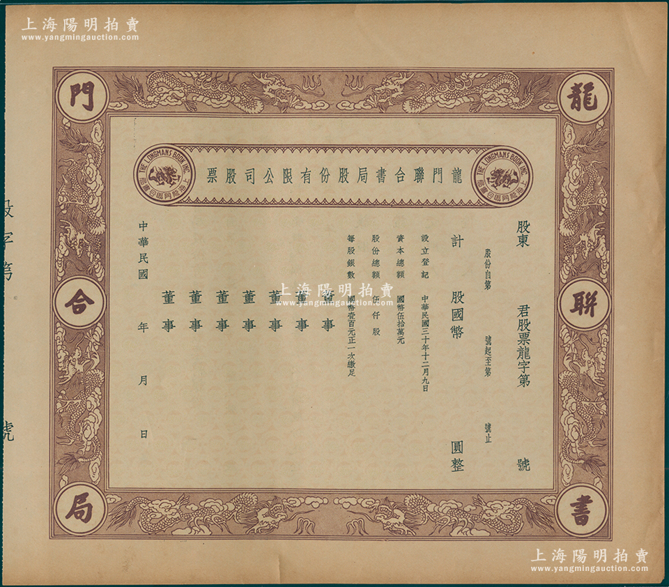 民国三十年(1941年)龙门联合书局股份有限公司股票,未填用,上印八龙图,形制美观;此乃老上海著名书局,主要出版科技类图书和高等学校理工类教材及工具书,即今科学出版社之前身;少见且属首度公诸于阳明,近八成新