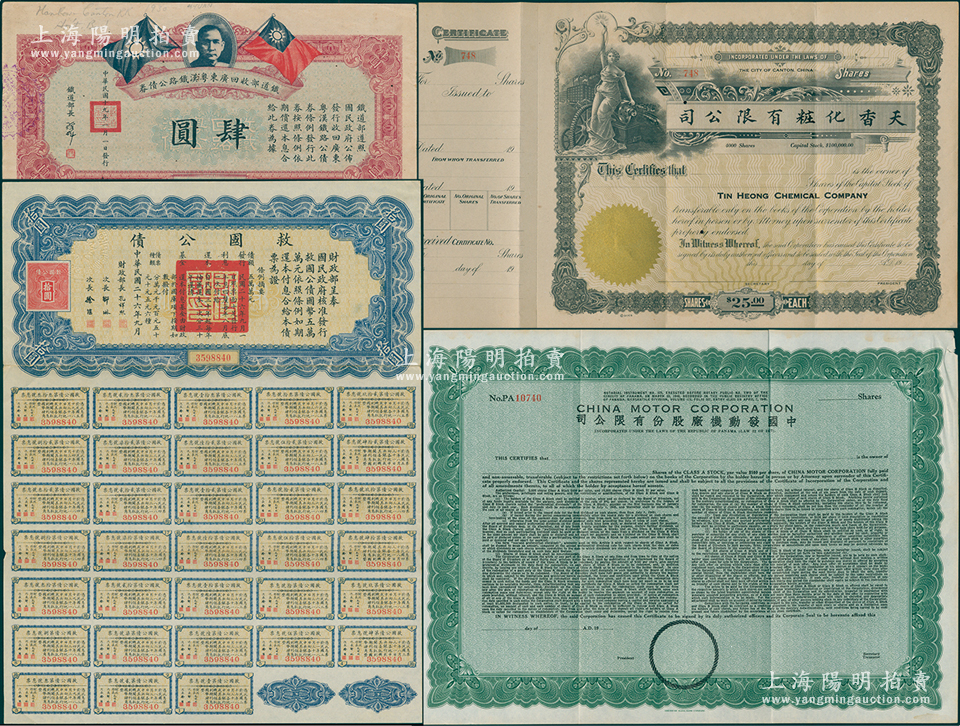 民国股票债券4种,详分:19xx年天香化妆有限公司股票、1948年中国发动机厂股份有限公司股票,未填用,均属华侨企业;1930年铁道部收回粤汉铁路公债券肆圆;救国公债1937年拾圆;海外藏家出品,八成新