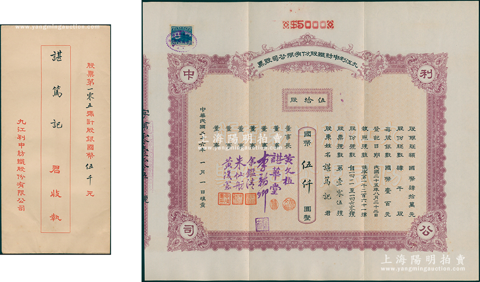 民国二十六年(1937年)九江利中纺织股份有限公司股票,伍拾股计国币伍仟圆,附带原封套;该公司原为久兴纱厂,至1934年被美商吞并,1935年朱仙舫等人租办并改名利中纱厂,1945年朱仙舫等人集资向美商买回工厂,改名兴中纱厂;少见且属首度公诸于阳明,九成新