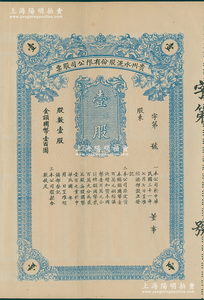 民国三十一年(1942年)贵州水泥股份有限公司股票,壹股国币壹百圆,未填用附存根;该公司由贵阳市长何辑五所倡导,属省营官商合办企业,至1944年因经营不善,并入到华新水泥公司;少见,八五成新