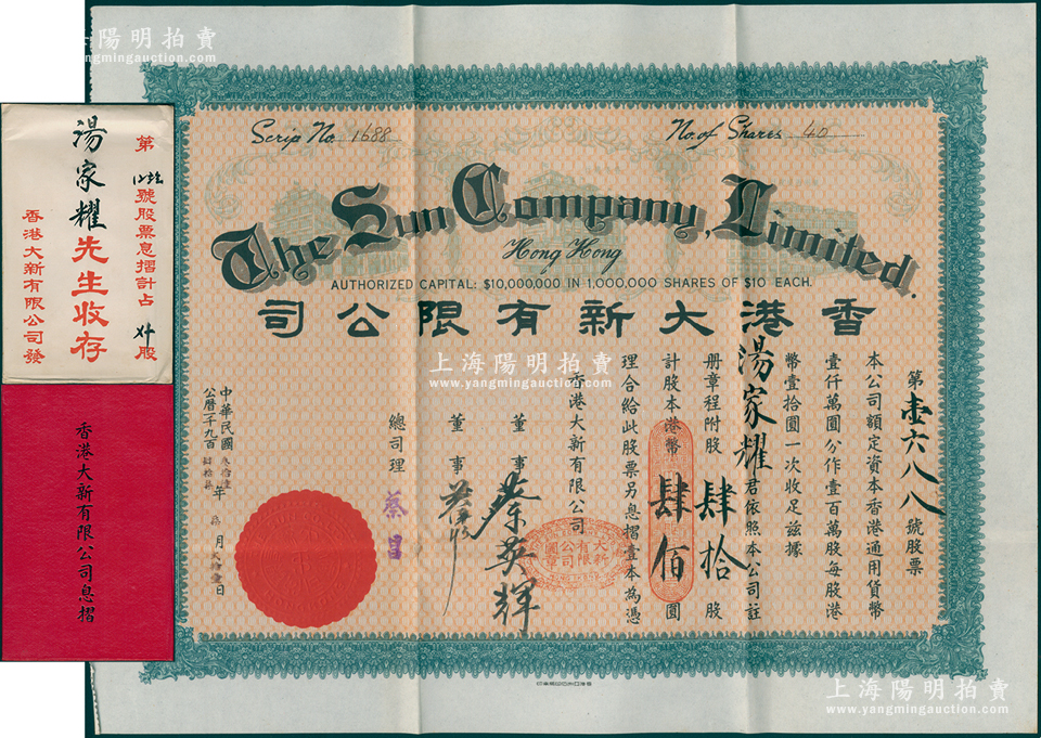 民国叁拾陆年(1947年)香港大新有限公司股票,肆拾股计港币肆佰圆,属旧中国四大百货公司之一,票上总司理乃是香港商业巨子蔡昌,附带原封套和息摺;香港藏家出品,罕见,八五成新