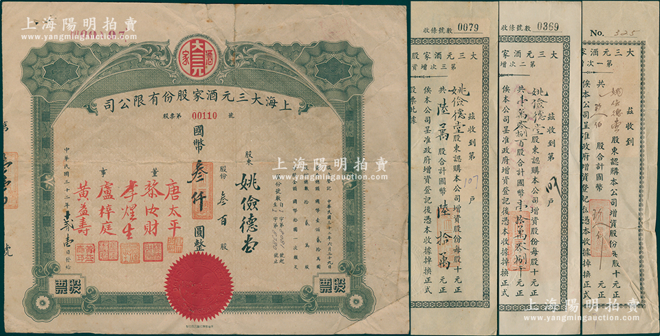 民国三十二年(1943年)上海大三元酒家股份有限公司股票,叁佰股计国币叁仟圆,附带第一、二、三次增资股款收据各1枚;该酒店乃老上海南京路之著名粤菜馆,票上董事唐太平乃近代著名“药王”唐拾义之子;源于唐拾义家族之遗存,罕见,七成新