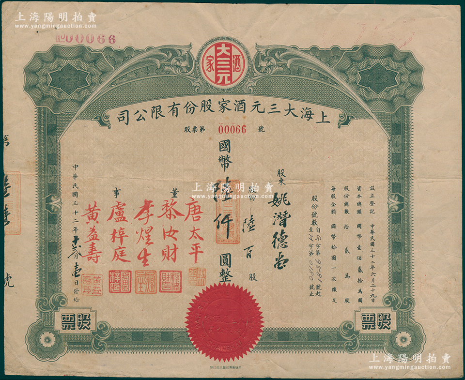 民国三十二年(1943年)上海大三元酒家股份有限公司股票,陆佰股计国币陆仟圆;该酒店乃老上海南京路之著名粤菜馆,票上董事唐太平乃近代著名“药王”唐拾义之子;源于唐拾义家族之遗存,罕见,七五成新
